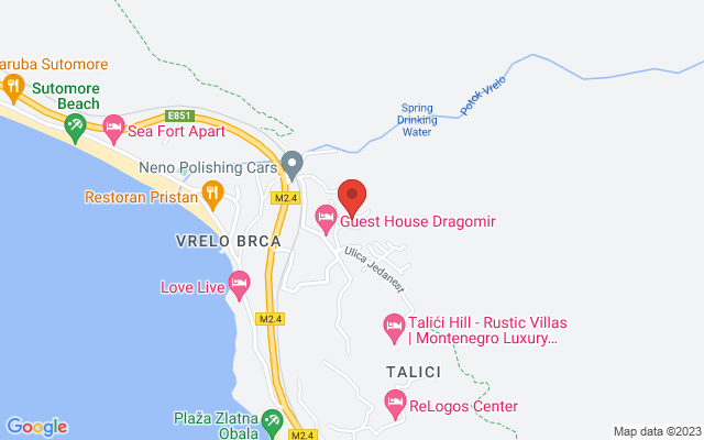 Kuća se nalazi u Sutomoru, u naselju Brca. Kuća je sa magistralom povezana asfaltiranom ulicom (cca 200 m) i posjeduje sve komunalne priključke (voda, kanalizacija, struja, telefon). U samom naselju se nalazi samoposluga i dvije prodavnice. U centru Sutomora, koje je na manje od 2 km, nalazi se više samoposluga i manja zelena pijaca. Pozicionirana je na uzvisini (74 m nadmorske visine), iznad plaže, magistralnog puta i železničke pruge Beograd-Bar. Do pješčane plaže - zaliva dužine 2, 5 km, vodi staza ispod puta i pruge dužine 600 m, a može se i kolima. Pogled je usmjeren i na planine u zaleđu i na more - pogled na otvoreno more i na kraj zaliva gđe se nalaze ostaci tvrđave Spič. Sve sobe izlaze na terase. Građena je između 1990 i 2000. godine, od čvrstog materijala s prvoklasnom stolarijom . Zidovi su gletovani i okrečeni u bijelo. Kupatila i kuhinja su obrađeni keramičkim pločicama. Svi podovi u kući su u keramičkim pločicama, a terase, hodnik i stepenište su obrađeni mermerom. Fasada je đelimično premazana akrilnom bojom sa rustičnom obradom, a zidovi svih terase su obrađene kamenim pločama . Posjeduje i cistijernu sa cca 3m kubna tehničke vode.